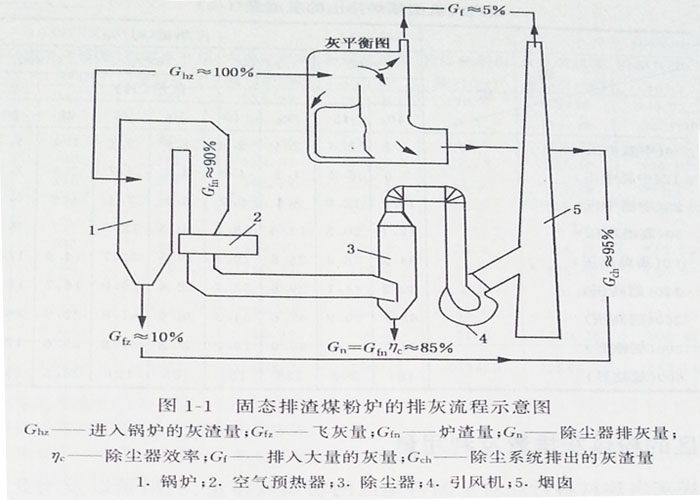 在鍋爐排出的灰渣中,除有一部分灰量隨煙氣排至大氣外,其余都將由除灰渣系統(tǒng)排出,圖1—1是固體排渣煤粉爐的排灰流程示意圖。