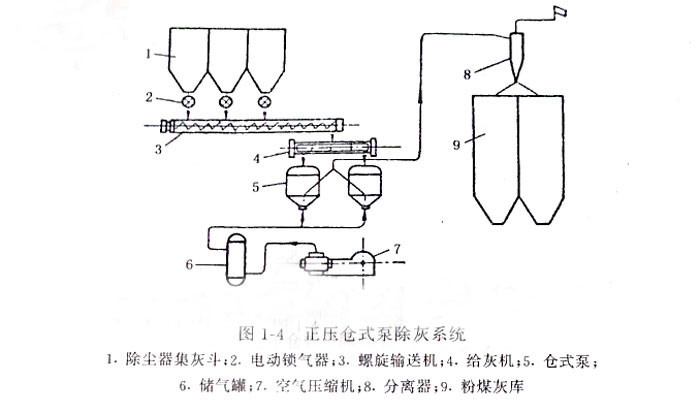 圖1—4是常用的正壓倉式泵除灰系統(tǒng),在此系統(tǒng)中,從干式除塵器分離下的灰,經(jīng)電動鎖氣器、螺旋輸送機(jī)和給灰機(jī)進(jìn)入倉式泵、用壓縮空氣將灰吹送。